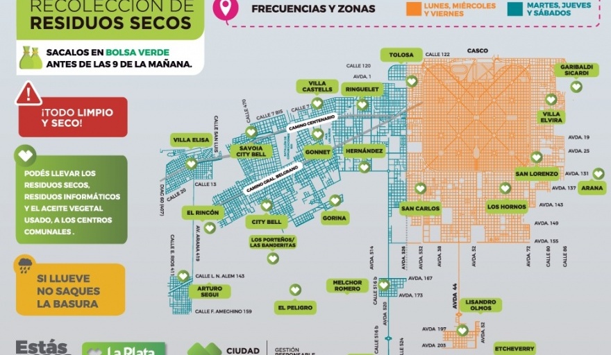 En ese sentido, a partir de este lunes 7 de octubre, la Secretaría de Espacios Públicos y Gestión Ambiental de la Comuna ampliará la zona de cobertura del sistema de recolección de la bolsa verde y contará con una cobertura de 15 mil cuadras, 5 mil más que las que actualmente cuentan con el servicio. Al respecto, el titular del área municipal, Marcelo Leguizamón, detalló: “Dentro de los avances que buscamos en la firma del nuevo contrato para la recolección de residuos, se buscó ampliar el sistema de la ‘bolsa verde’”, y adelantó: “Desde la semana que viene, en vez de recuperar residuos secos de 10 mil cuadras de la ciudad, los camiones lo harán en 15 mil”. Según se informó, los días lunes, miércoles y viernes, el servicio recogerá las bolsas verdes por el territorio del casco urbano y la zona comprendida desde la calle 526 hacia el sur del Partido de La Plata; mientras que los martes, jueves y sábados, lo hará desde la calle 526 hacia la zona norte de la ciudad, siempre a partir de las 9 de la mañana. “Es una iniciativa muy importante a nivel ambiental, ya que permitirá recolectar un 50% más de residuos reciclables, lo que se traduce en menos contaminación y más reutilización”, remarcó el subsecretario de Gestión Ambiental de la Comuna, Germán Larrán, y señaló: “Esperamos concientizar e incentivar a los vecinos a que separen la basura y respeten los días y horarios para mantener la ciudad cada vez más limpia y colaborar, entre todos, con la cuestión ambiental y social”. Cabe destacar que la ‘Bolsa Verde’ debe contener sólo residuos secos, como vidrio, plástico, metal, tela, papel, cartón y envases brik, todo perfectamente limpio y seco: mientras que la tradicional bolsa negra debe utilizarse para desechar residuos húmedos, como restos de comida, entre otros. Del mismo modo, es importante señalar que los vecinos sólo deben sacar la bolsa verde entre las 8 y las 9 de la mañana y los días que pasa el recolector, y nunca sacarla fuera de esa franja horaria, como tampoco los días que no están contemplados en la recolección de esa zona. Finalmente, Larrán informó que “los vecinos que estén interesados en entregar material reciclable, van a poder acercarlo en cualquiera de los centros comunales, que funcionarán especialmente como ‘centros verdes’ de acopio”, y puntualizó: “Ahí podrán llevar residuos reciclables, aceite vegetal usado y material informático, entre otros”.