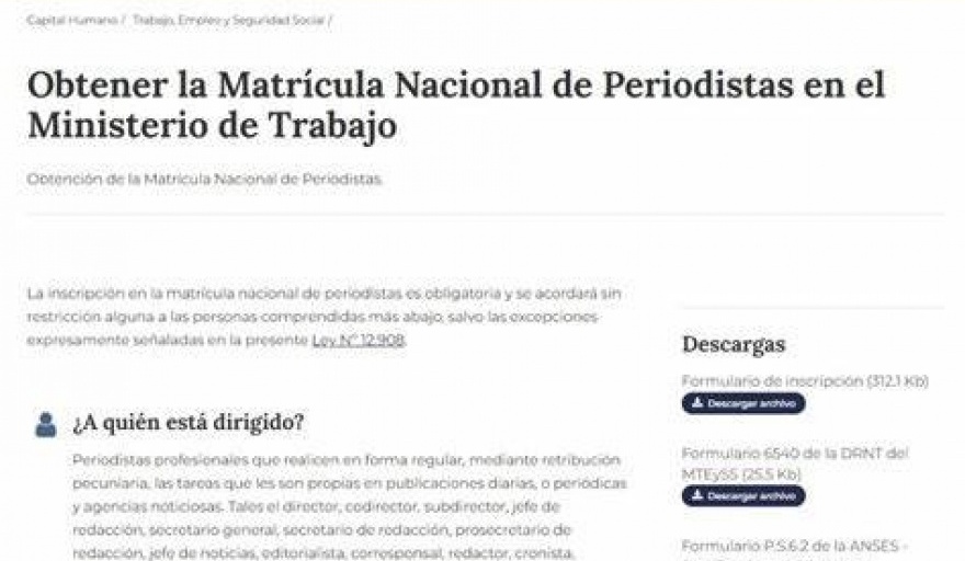 ¿Pero, a quién está dirigida esta normativa que impulsa el Gobierno?. Según explica el formulario a: "Periodistas profesionales que realicen en forma regular, mediante retribución pecuniaria, las tareas que les son propias en publicaciones diarias, o periódicas y agencias noticiosas. Tales el director, codirector, subdirector, jefe de redacción, secretario general, secretario de redacción, prosecretario de redacción, jefe de noticias, editorialista, corresponsal, redactor, cronista, reportero, dibujante, traductor, corrector de pruebas, reportero gráfico, archivero y colaborador permanente".