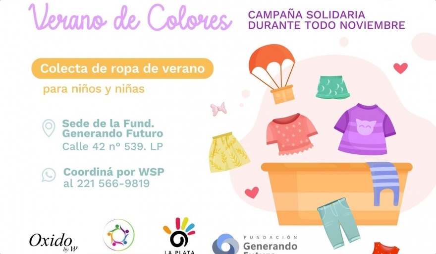 La Plata Solidaria y la Fundación Generando Futuro lanzan una campaña Solidaria de ropa y calzado de verano para niños y niñas. Lo recaudado será distribuidor en escuelas, comedores y merenderos del Gran La Plata. Para sumarse contacto WhatsApp 221-566-9819. Instagram @laplatasolidariaok y Fundación Generando Futuro