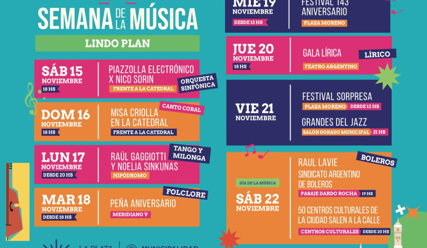 En el marco del 143° aniversario de la fundación de La Plata, la Municipalidad anunció la realización de la Semana de la Música, que se llevará a cabo del 15 al 22 de noviembre con una variada agenda de actividades culturales y artísticas en distintos espacios de la ciudad.
