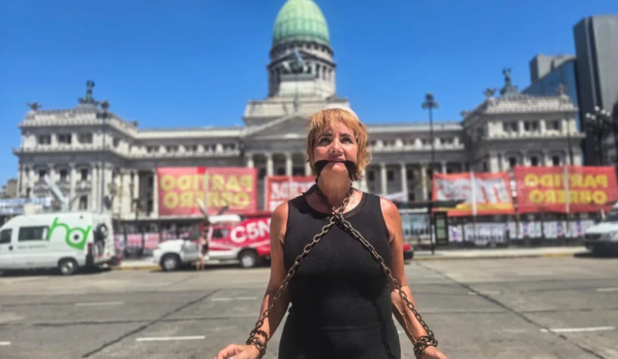 La periodista Nancy Pazos se encadenó frente al Congreso de la Nación Argentina en rechazo al proyecto de reforma laboral que impulsa el Gobierno y que contempla la derogación del Estatuto del Periodista.