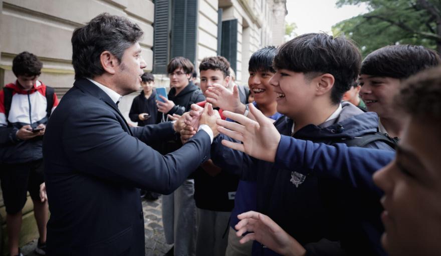 El mandatario provincial trazó un paralelismo con la actualidad: “El ataque a la ciencia y la educación pública no es casual, responde a un proyecto que busca desindustrializar la Argentina”. La frase resonó en un colegio emblemático de La Plata, donde la defensa de la educación pública tiene fuerte arraigo.