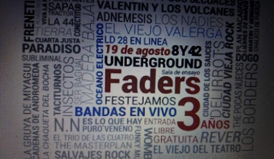 El sábado próximo, 19 de agosto, a las 21 hs se realizará un festival de rock solidario, en Underground, calle 8 esq. 42, organizado por Producciones Faders, en virtud de celebrarse el tercer aniversario de su Sala de Ensayo, con la presentación de 10 bandas entre las que se destacan Océano Eléctrico (Buenos Aires), El viejo Valerga, Ld 28 en linea, Salvajes, Almas Muertas, Dani Sbarra nexo y Los Nadies.