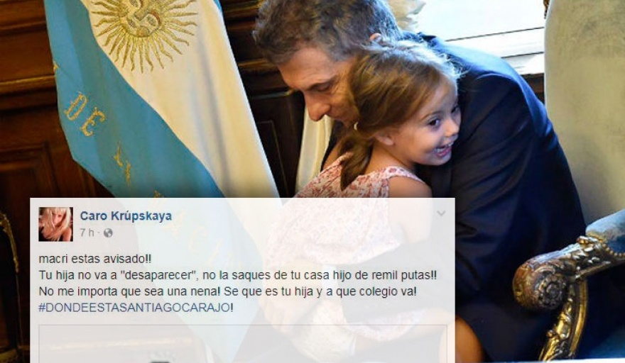 "Macri estás avisado!! Tu hija no va a "desaparecer", no la saques de tu casa hijo de remil putas!! No me importa que sea una nena! Se que es tu hija y a que colegio va #DONDEESTASANTIAGOCARAJO!", fue el mensaje que se publicó anoche en el perfil de Caro Krúpskaya. Algunos usuarios de las redes sociales vincularon esa cuenta a Carolina Pavlovsky, hija del actor Eduardo 'Tato' Pavlovsky. El mensaje ya no aparece en el perfil de la mencionada mujer.