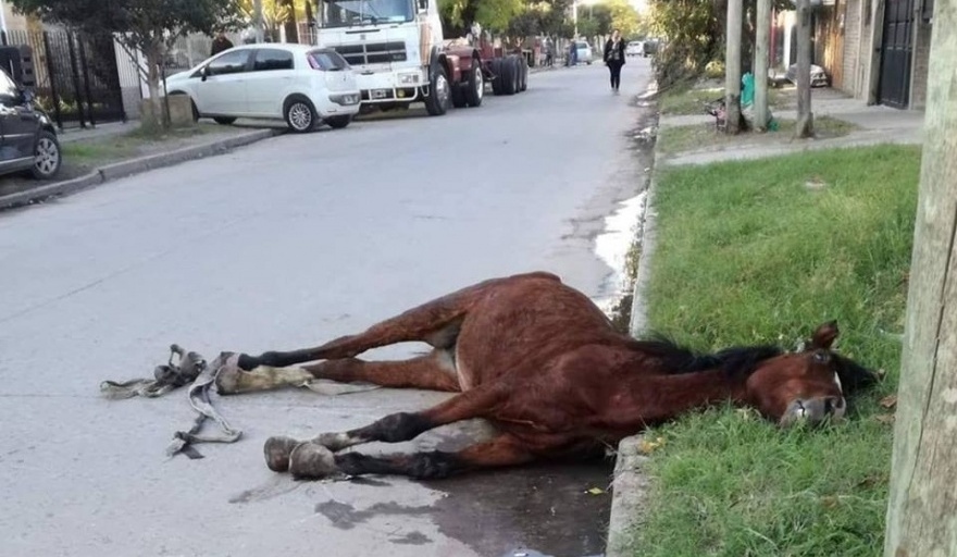 La yegua terminó desplomándose aún viva contra el asfalto de una calle. Estaba agotada por transitar tantos kilómetros y totalmente sedienta por el agua que le negaban, afirman los proteccionistas.