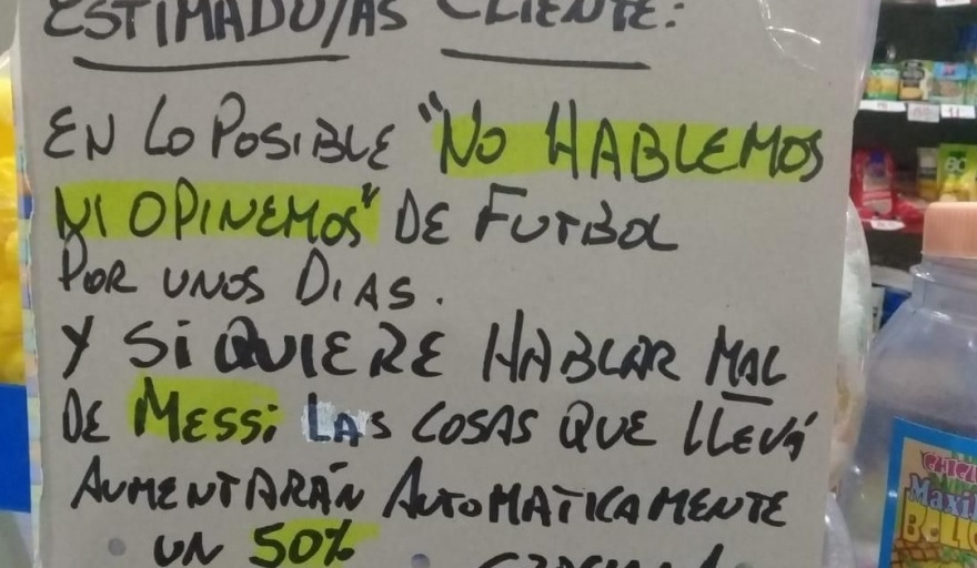 "En lo posible 'no hablemos ni opinemos' de fútbol por unos días. Y si quiere hablar mal de Messi las cosas que lleva aumentarán automáticamente un 50 %", se lee en el cartel.